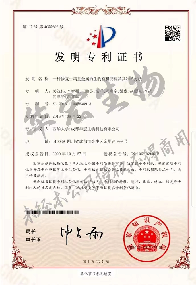 一種修復土壤重金屬的生物有機肥料及其制備方法專(zhuān)利證書(shū)